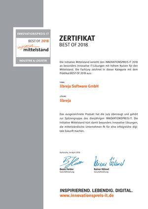 libreja hat als innovative IT-Lösung die Experten-Jury überzeugt und erhielt 2018 in der Kategorie „Industrie & Logistik“ die BEST-OF-Auszeichnung. Unter dem Motto „Inspirierend. Lebendig. Digital.“ bewarben sich mehrere hundert Unternehmen aus der IT-Branche. Eine unabhängige und hochkarätige Fachjury bestehend aus Professoren, Wissenschaftlern, IT-Experten und Fachjournalisten beurteilte die eingereichten IT-Produkte anhand eines objektiven Kriterienkatalogs, insbesondere dem Innovationsgehalt, dem Nutzen sowie die Eignung der IT-Lösungen für die mittelständische Wirtschaft. libreja überzeugte die Juroren mit seiner webbasierten Softwarelösung zur Bestandsverwaltung und -verfolgung, die es mittelständischen Unternehmen ermöglicht, Inventarisierung, Verleih- und Archivprozesse effizienter und kostensparender zu gestalten. Die Auszeichnung ist Bestätigung für uns mit unserem Produkt libreja eine sehr gute Lösung für die Digitalisierung von Prozessen anzubieten. Hier können Sie unser Zertifikat als PDF downloaden.